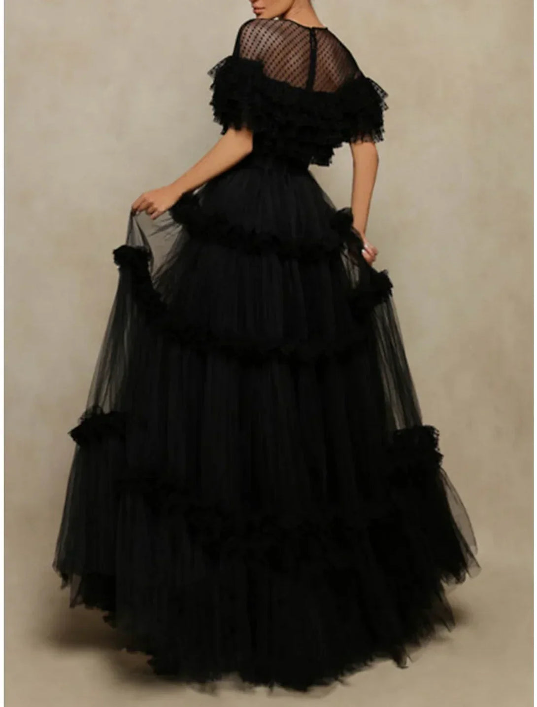A-Line Prom Dresses Elegant Dress Formal Floor Length Short Sleeve Jewel Neck Tulle with Pleats Ruffles Evening Dress