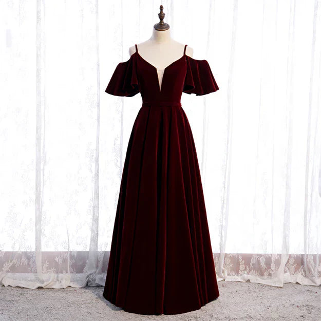 Beautiful Wine Red Velvet Off Shoulder Floor Length Party Dress Junior Prom Dress Elegant Evening Dress