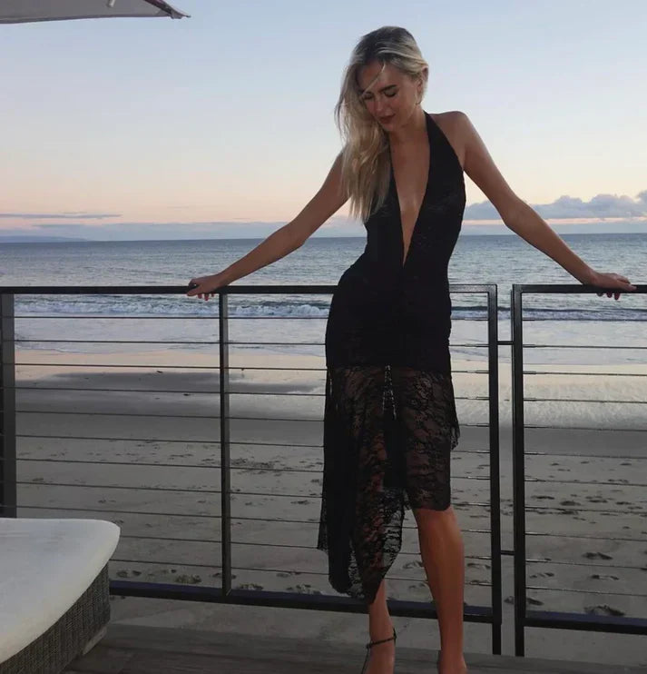 Black Halter Deep V Neck Lace Sexy Party Dress Charming Evening Dress Formal Dress