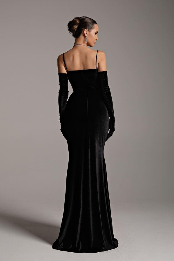 Black Velvet Long Gloves Spaghetti Straps Prom Dress ssr0257