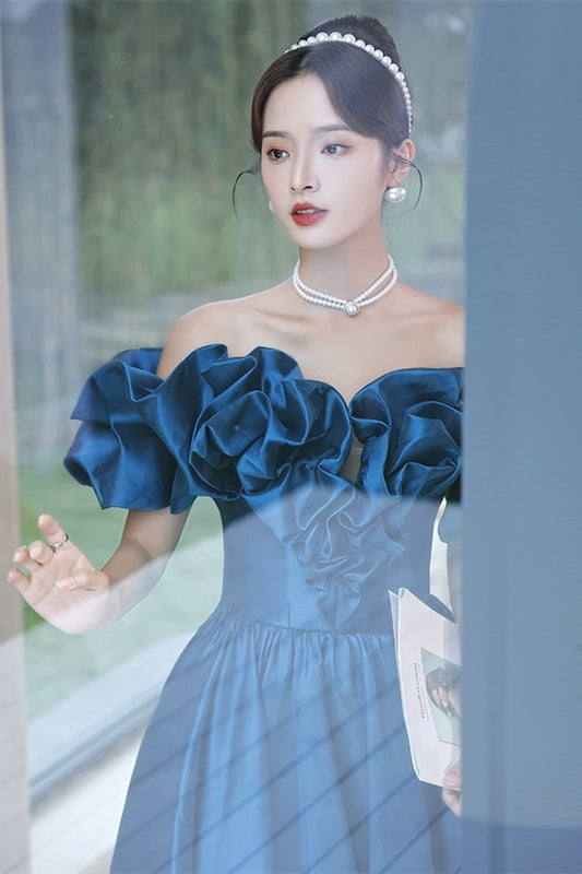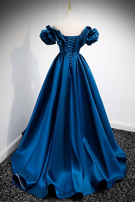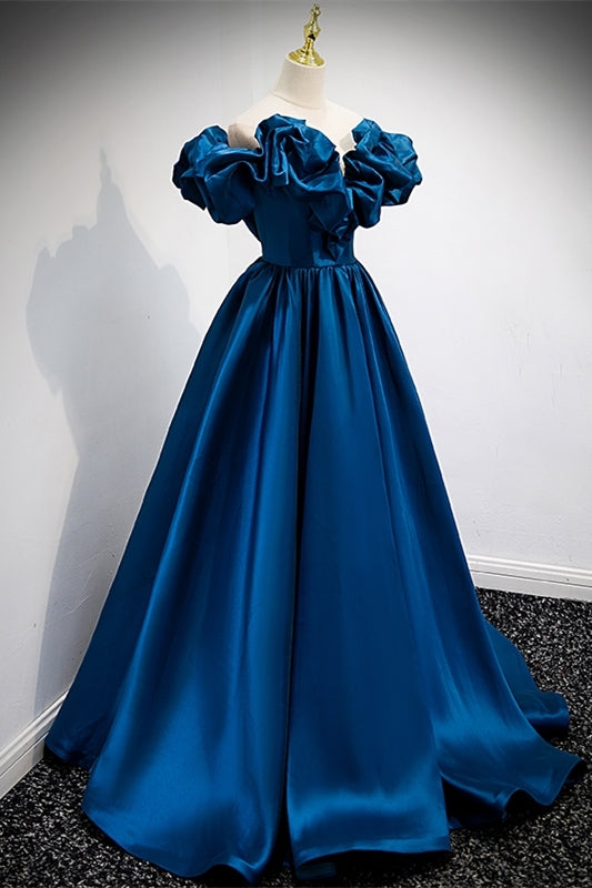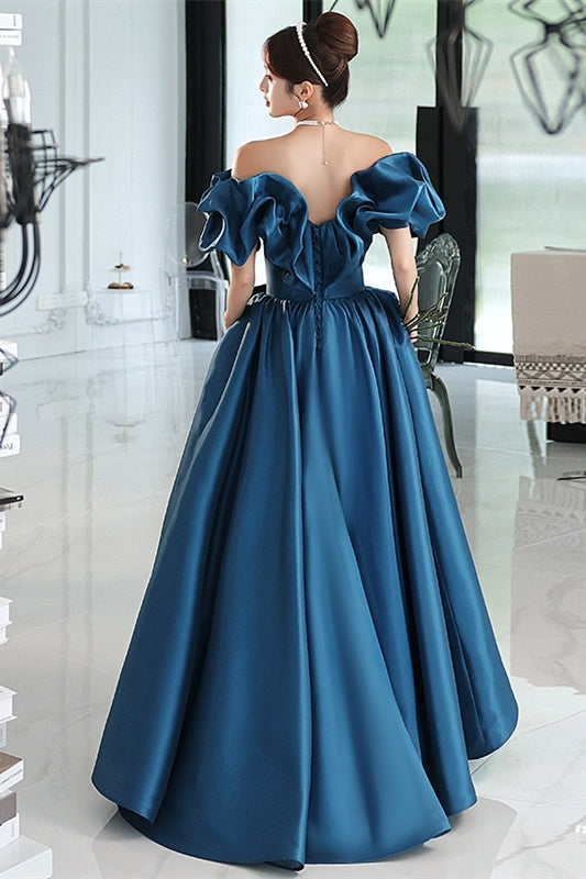 Blue Off the Shoulder A-line Satin Long Formal Dress