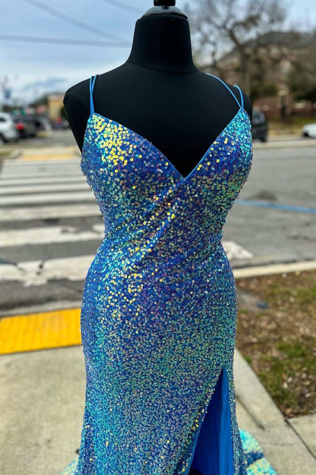Blue Sequin Straps Mermaid Long Party Dress with Slit