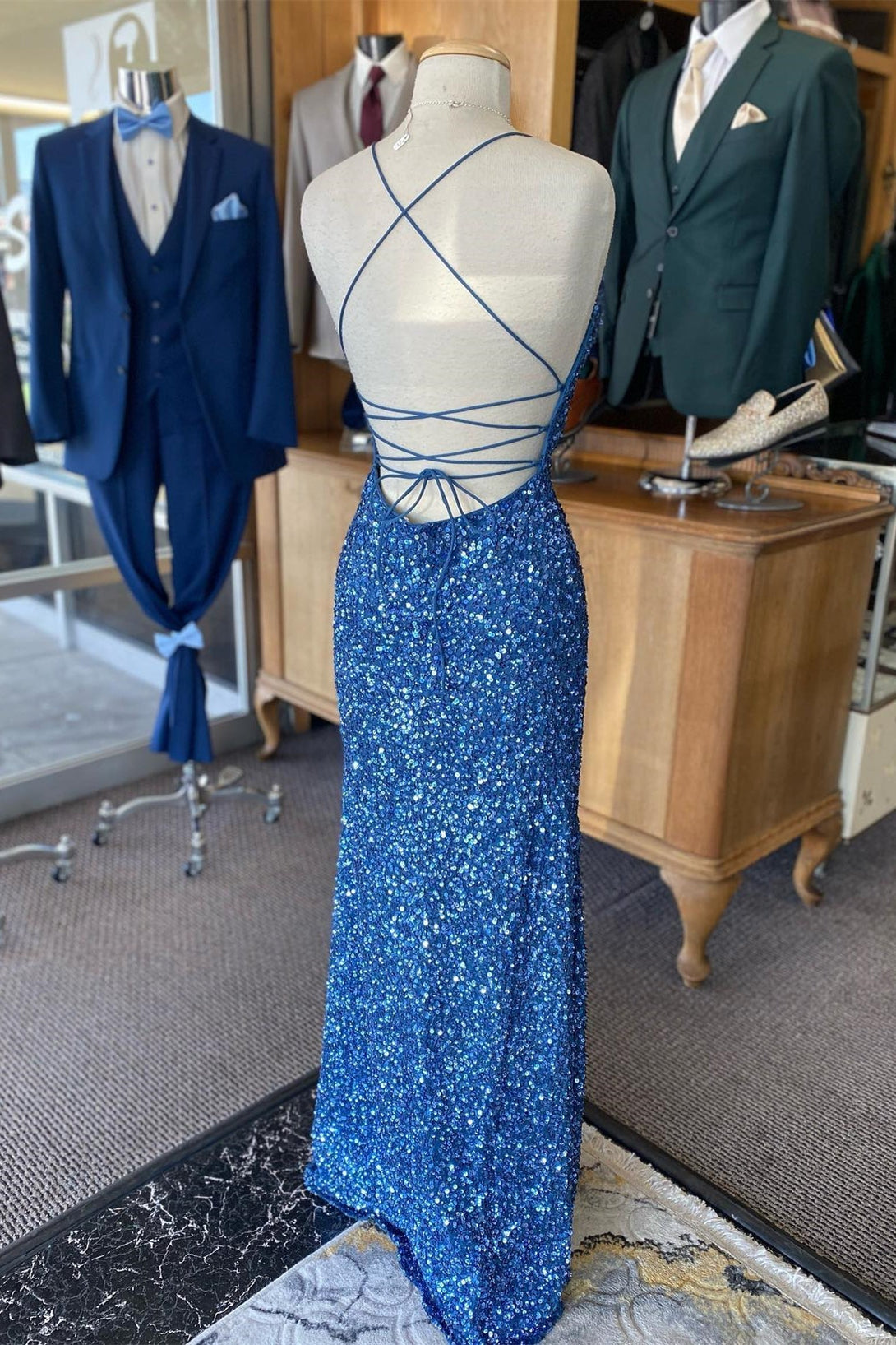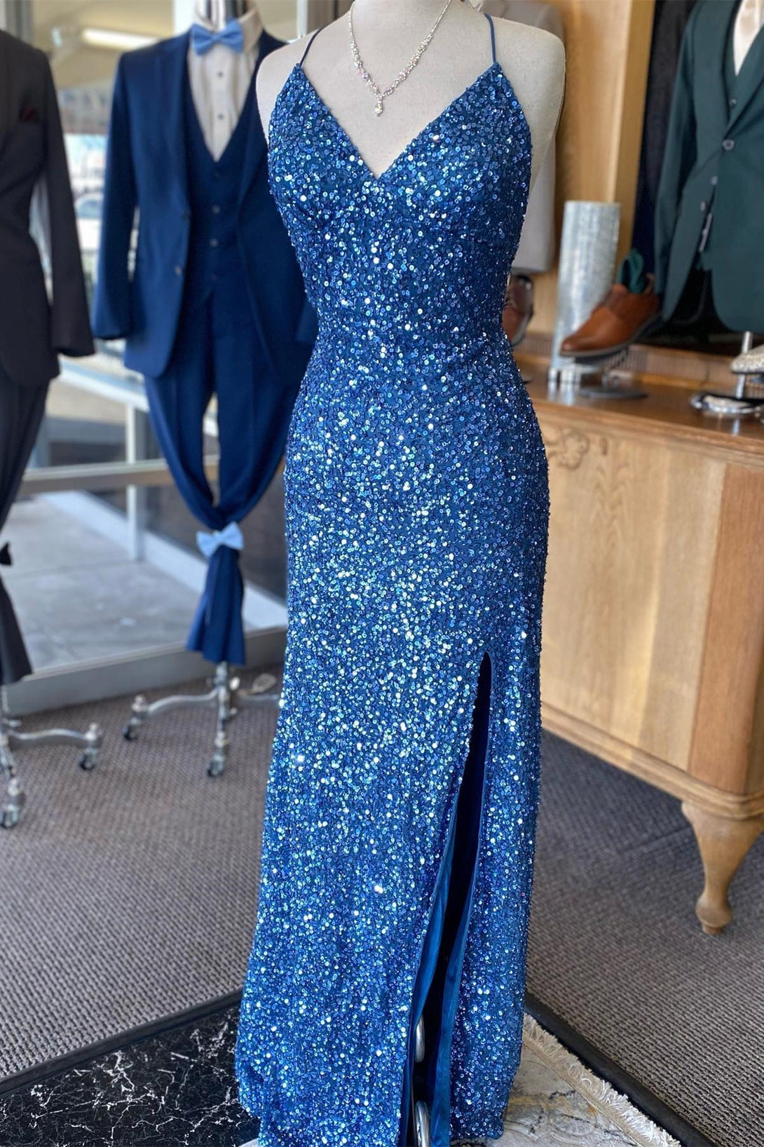 Blue Sequin V Neck Mermaid Long Prom Dress