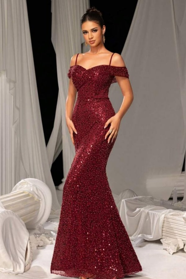 Burgundy Sequins Spaghetti-Straps Off-The-Shoulder Split Prom Dress ssr0614