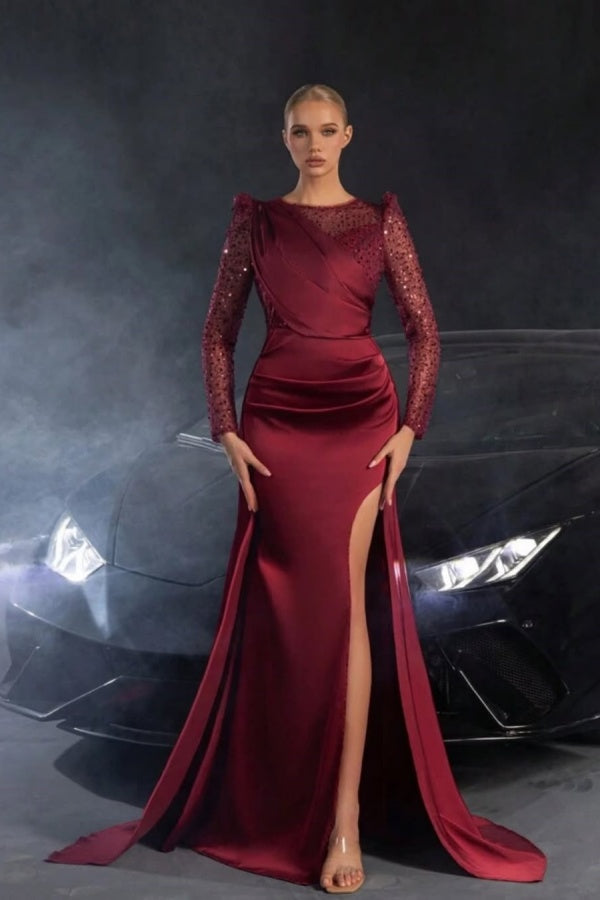 Burgundy Sequins Split Long Sleeves Prom Dress ssr0345