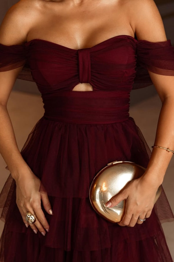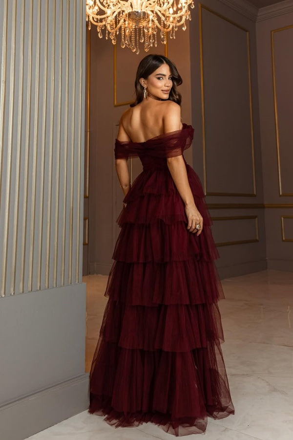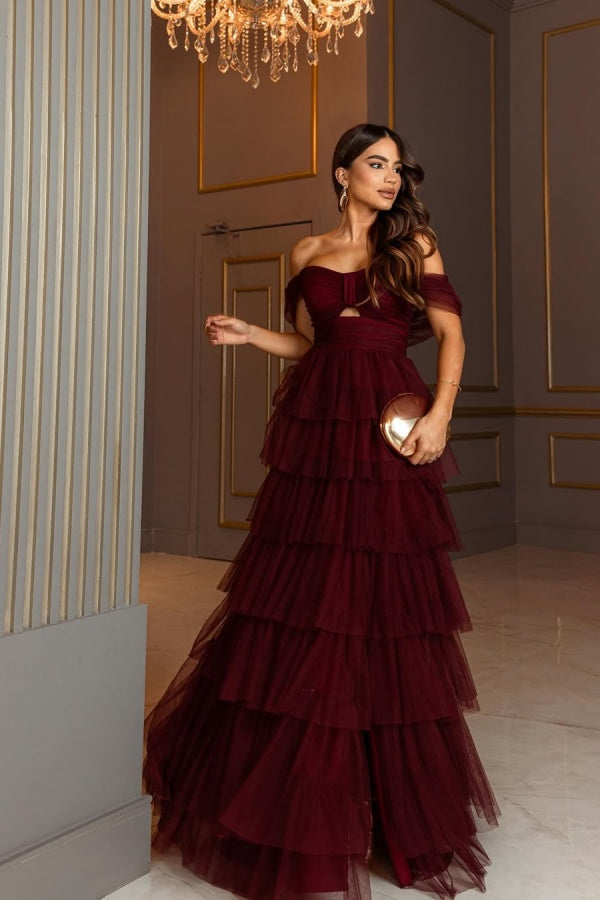 Burgundy Tulle A-Line Off-The-Shoulder Split Prom Dress ssr0559