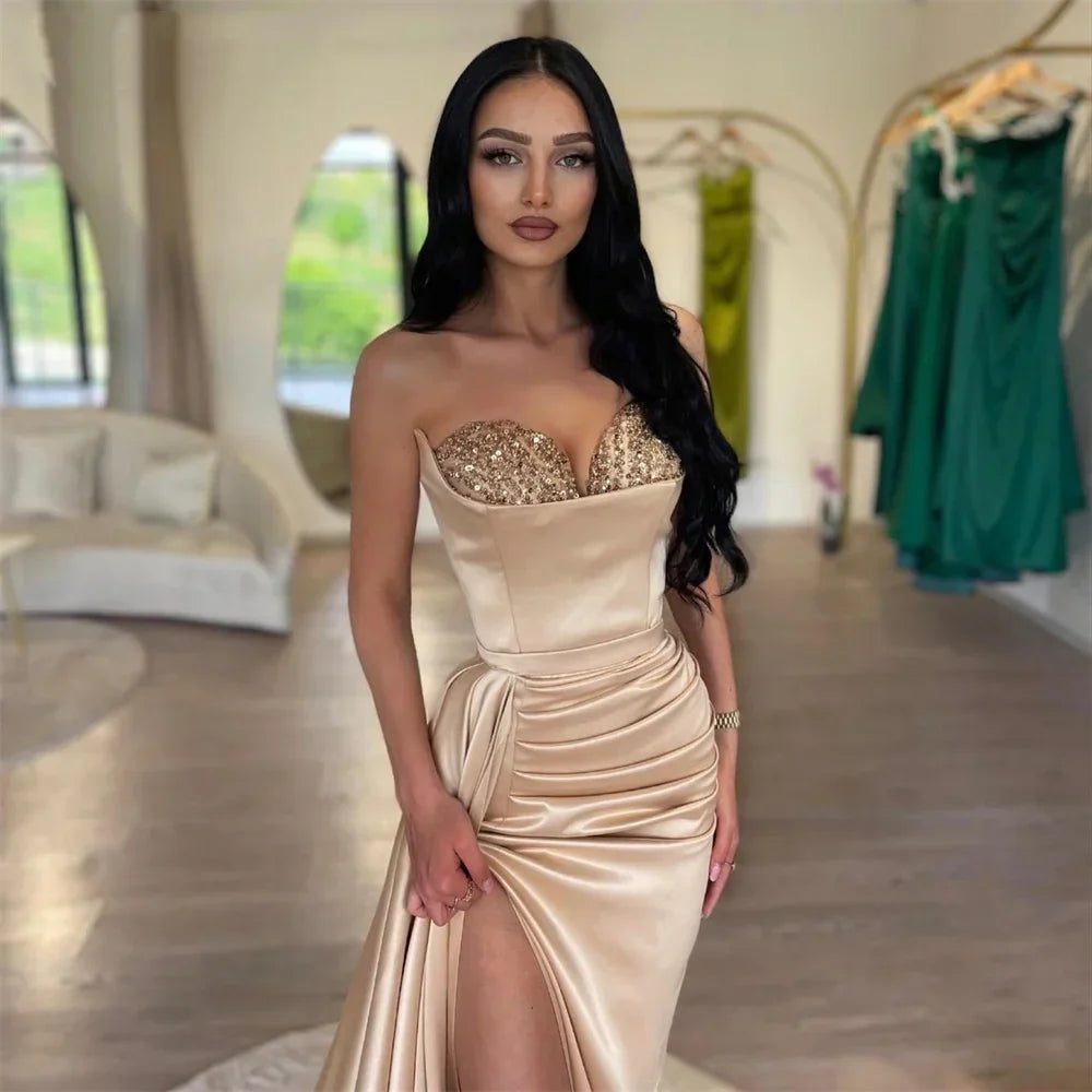 Champagne Sweetheart Satin Long Prom Dresses With High Split