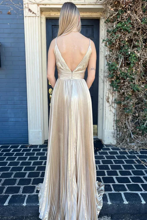 Champagne V Neck Spaghetti Straps A-Line Formal Party Dress Charming Evening Dress