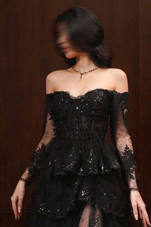 Charming Black Strapless Split Embroidered Lace Prom Dress ssr0619