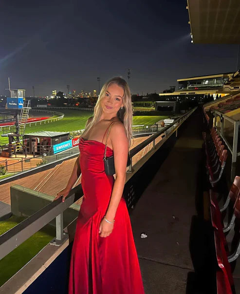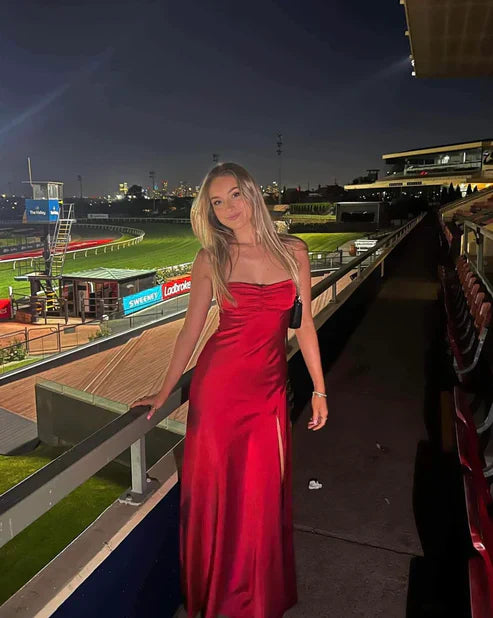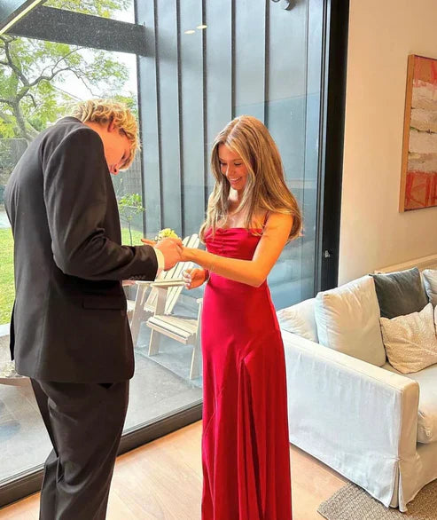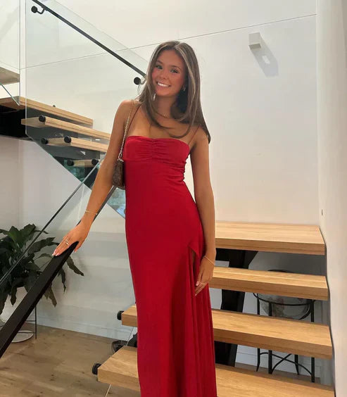 Charming Red Straps Satin Long Evening Party Dress with Split Simple Formal Dress