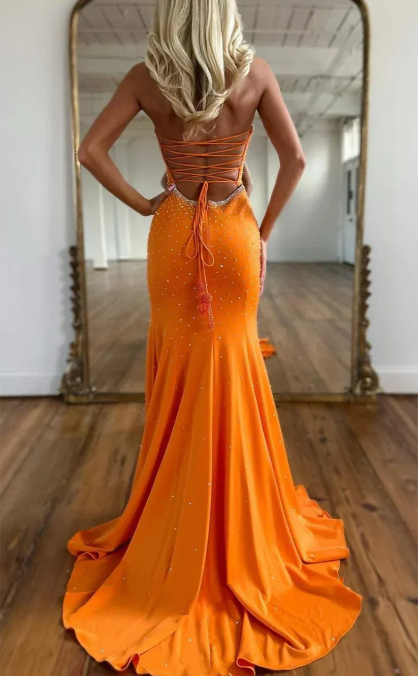 Cute Orange Beaded Split Mermaid Prom Dresses Long Celebrity Dress