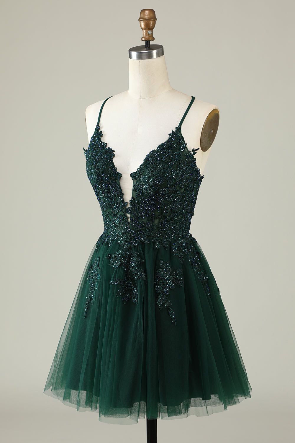 Dark Green Applique Beaded V-Neck Homecoming Dress Tulle Mini Party Dress