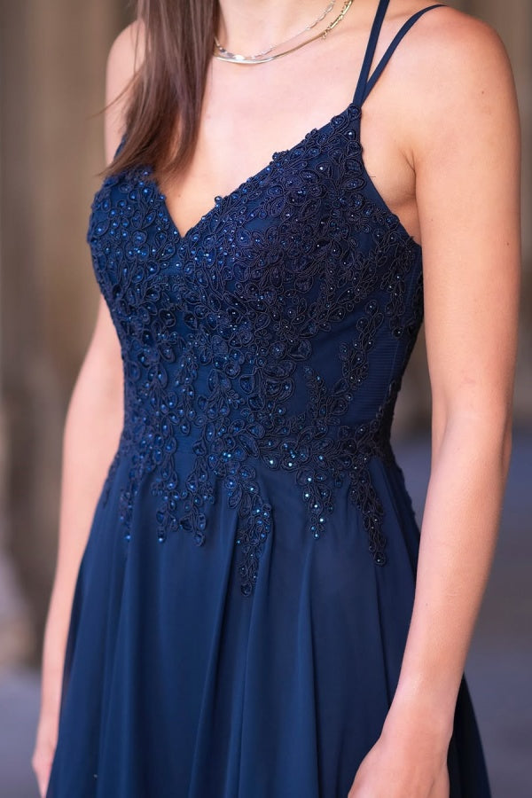 Dark Navy Chiffon Split Appliques Prom Dress ssr0520
