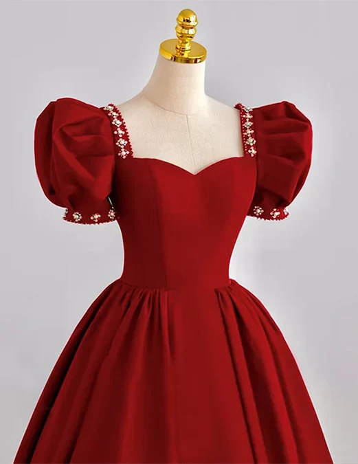 Dark Red Beaded Short Sleeves Tea Length Party Dress Formal Dress Prom Dress Elegant Evening Dress Cocktail Dress