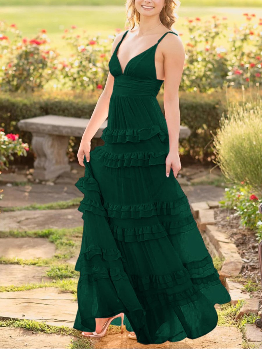 Decebal | A Line Pink Chiffon Tiered Ruffles Long Prom Dress
