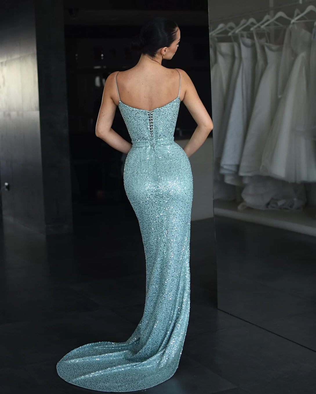 Elegant Blue Mermaid Prom Dresses Spaghetti Sequins Evening Dress Lace Up Back Pleats Split Formal Long Special Occasion Party dress Sparkly