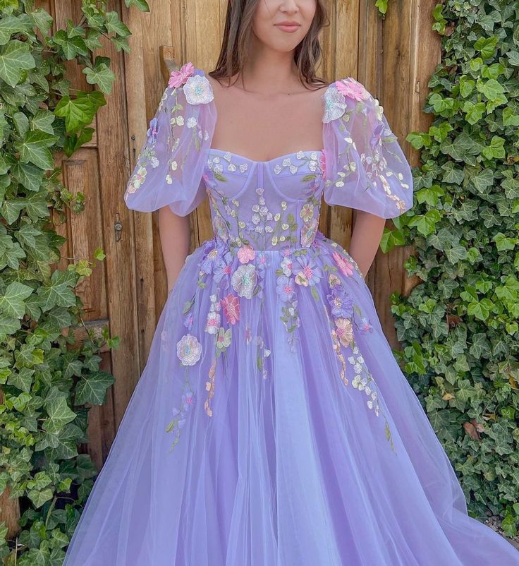 Elegant Floral Tulle 3D Flowers Prom Dresses With Bubble Sleeves