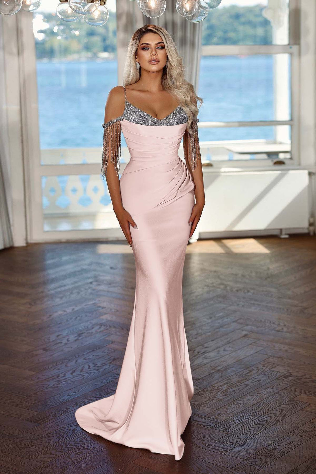 Elegant Lavender long evening dress Spaghetti strap with Pleated Sequins Tassel