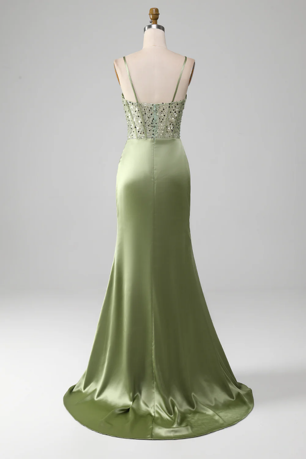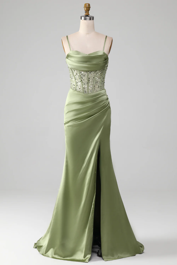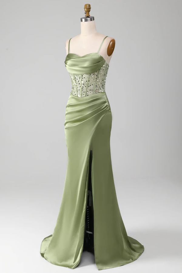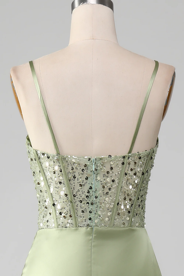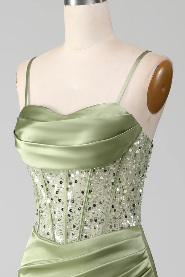 Elegant Light Green Sheath Split Sequins Pleated Prom Dress ssr0569