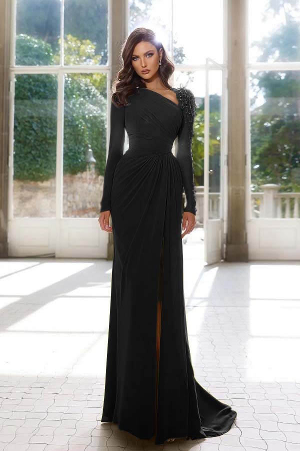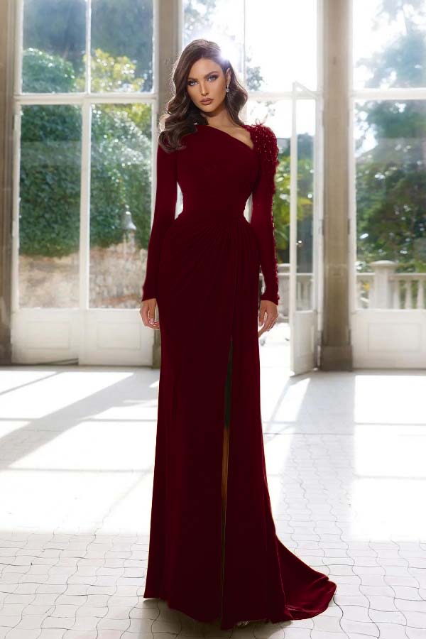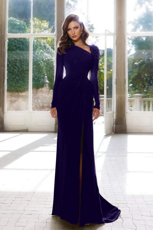 Elegant Long Sleeve Yellow Prom Dress Asymmetric Pleated Slit YH0001