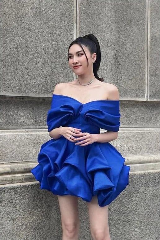 Elegant Royal Blue Bubble Off Shoulder Cheap Short Homecoming Dresses, SSR2901