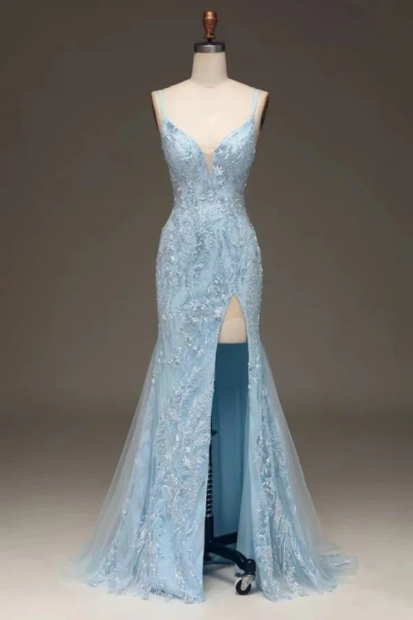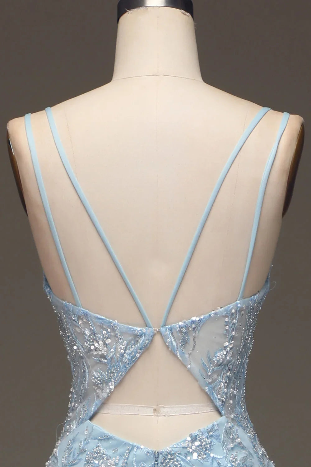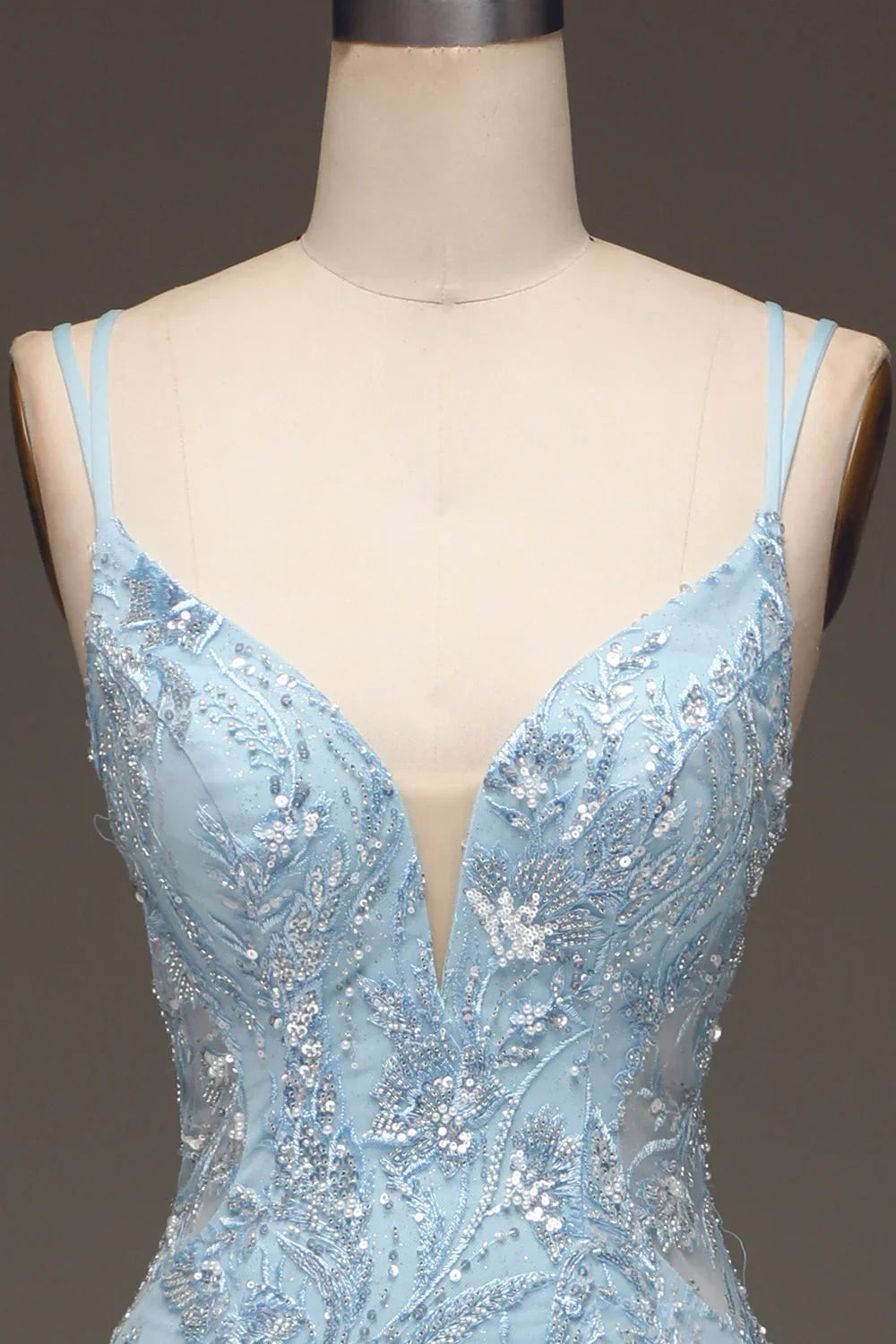Elegant Sky Blue Sequins Prom Dress Long Sliming Dress YX0043