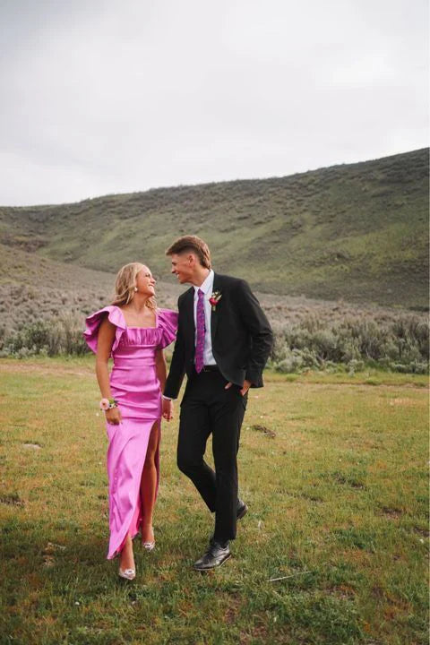 Elegant Square Neck Short Sleeves Long Prom Dress with Slit Charming Party Dress
