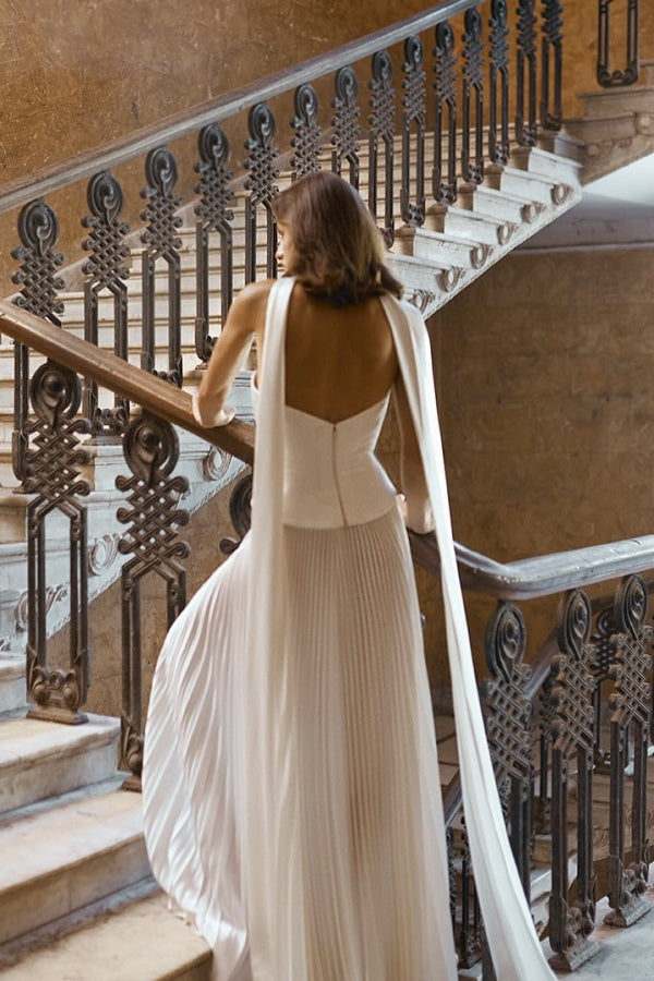 Elegant White Strapless Pleated Prom Dress With Long Scarf ssr0590