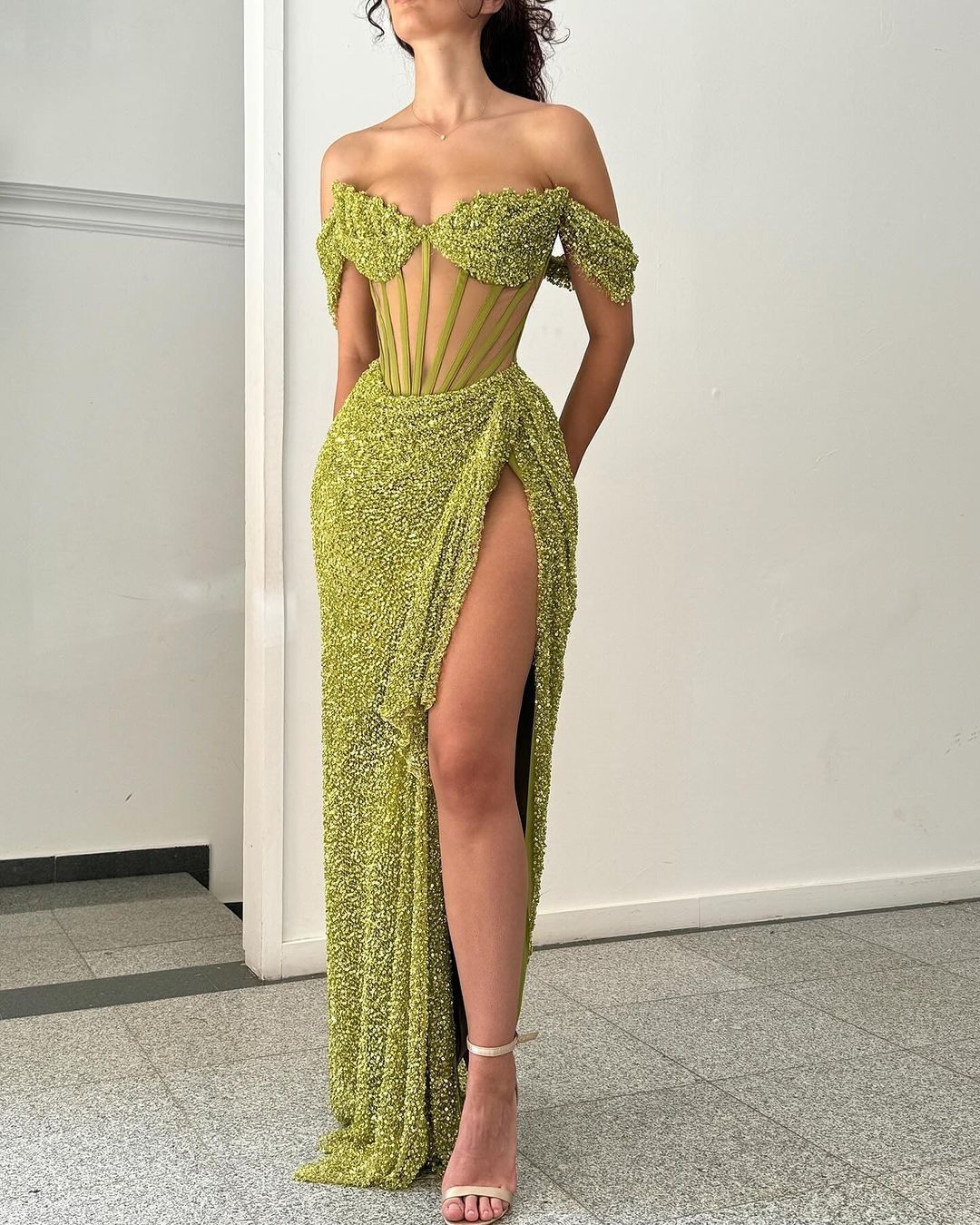 Exquisite Green Off-The-Shoulder Prom Dress With Thigh-High Split ssr0159