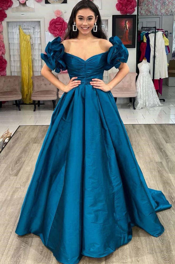 Flower Sleeves A-Line Hot Pink Evening Party Dress, Blue Long Satin Prom Dress 2025