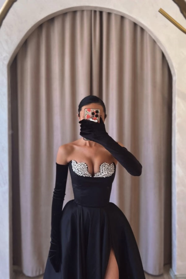 Formal Black Strapless Split Beaded A-Line Prom Dress With Velvet Gloves ssr0534