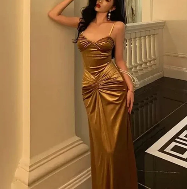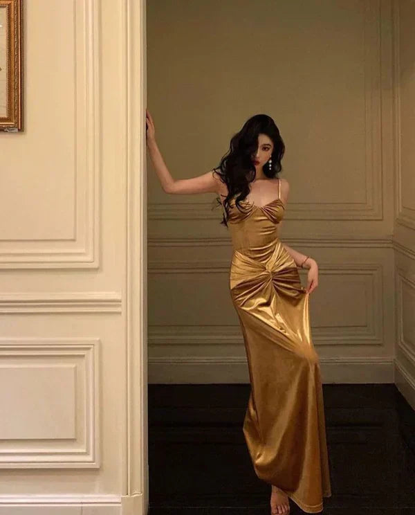 French Gold Velvet Slip Mermaid Prom Dress Long Evening Dress Charming Party Dress