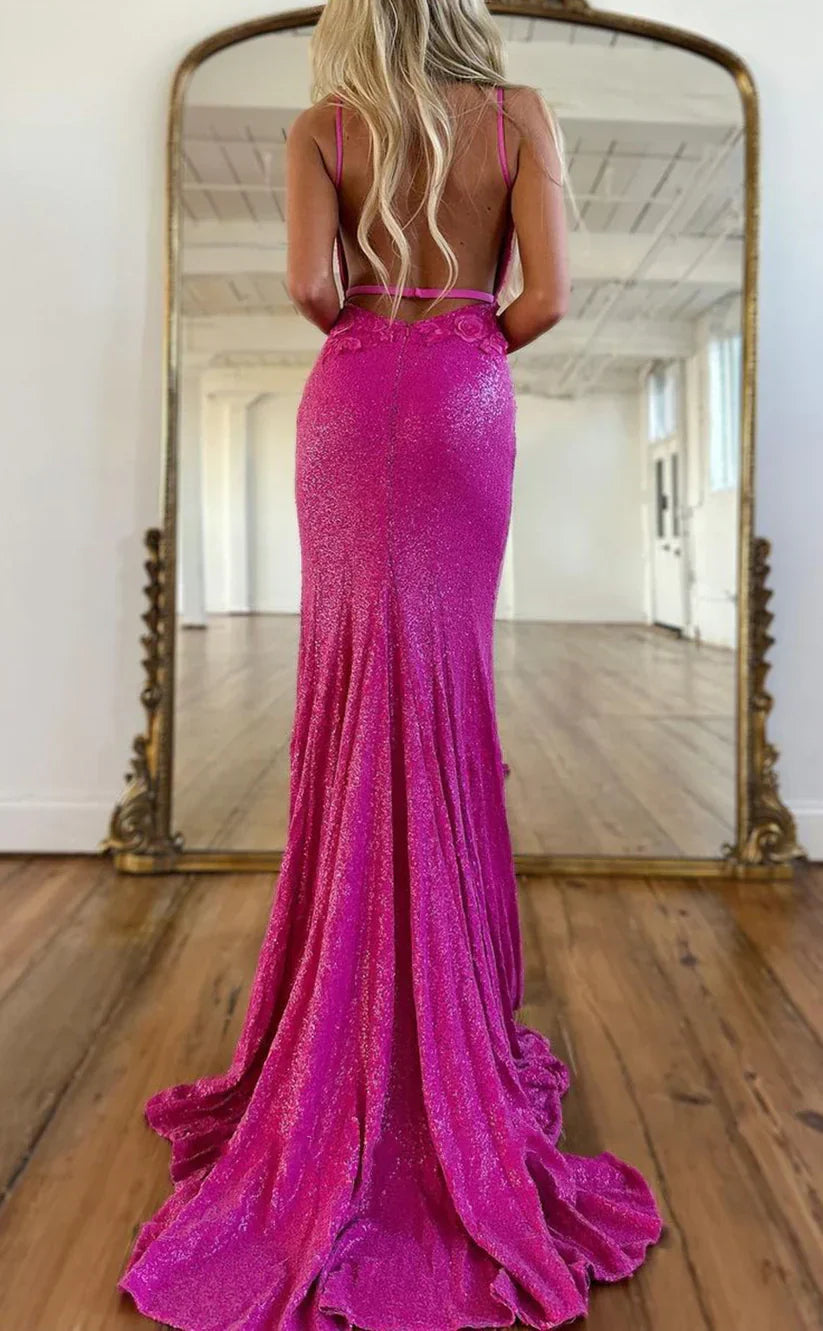 Fuchsia Bodycon Backless Sequin Prom Dresses With Side Slit