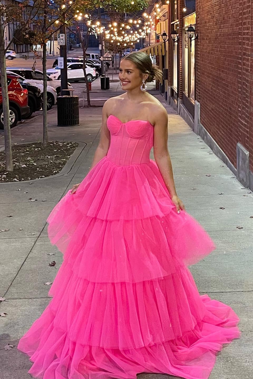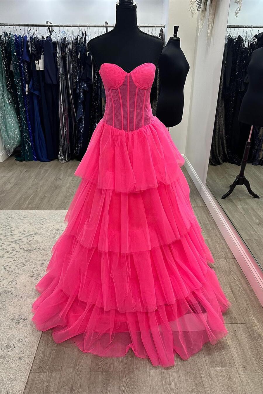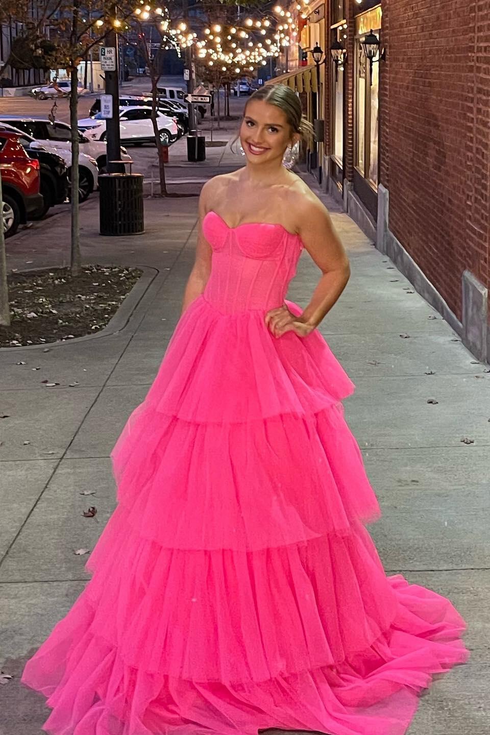 Hot Pink Corset Sweetheart Tiered Ruffles Long Prom Dress