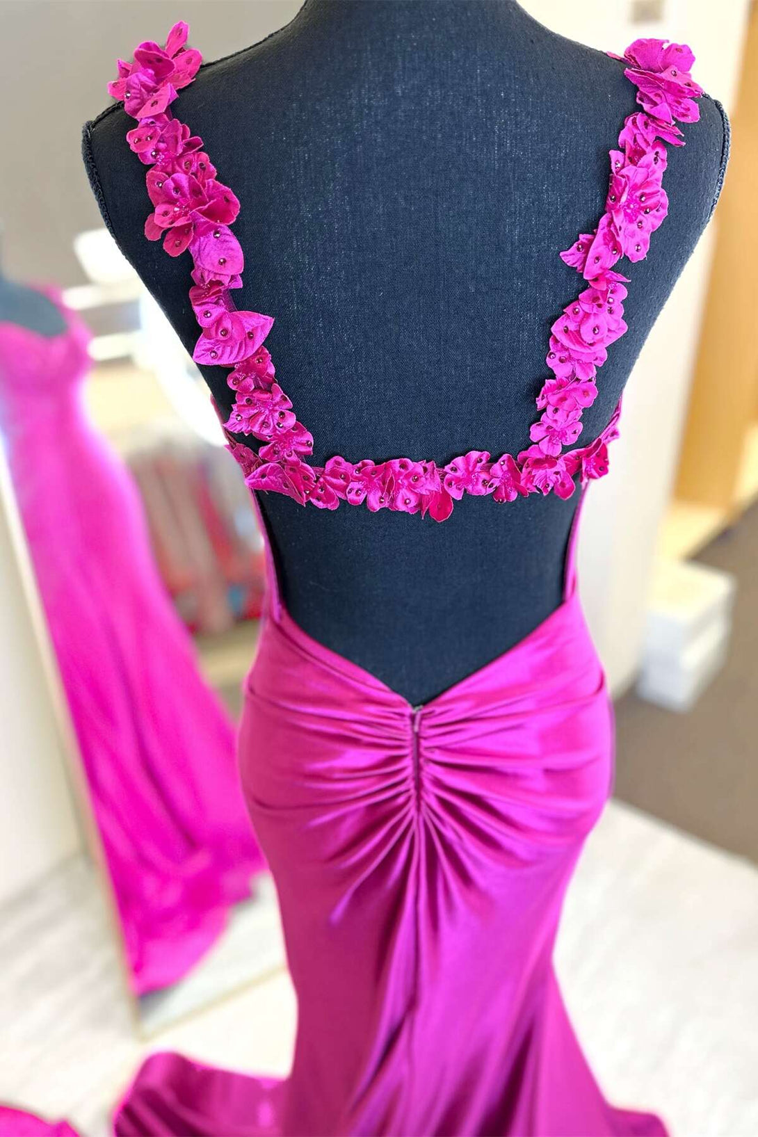 Fuchsia Satin Fitted Long Prom Dress with Slit