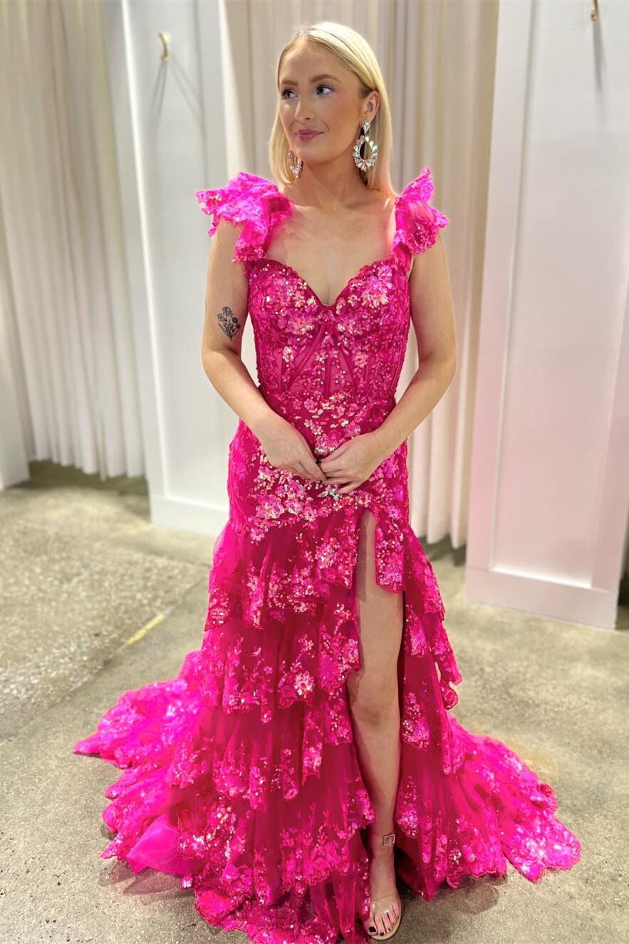 Fuchsia Sequin Mermaid Ruffles Long Formal Dress