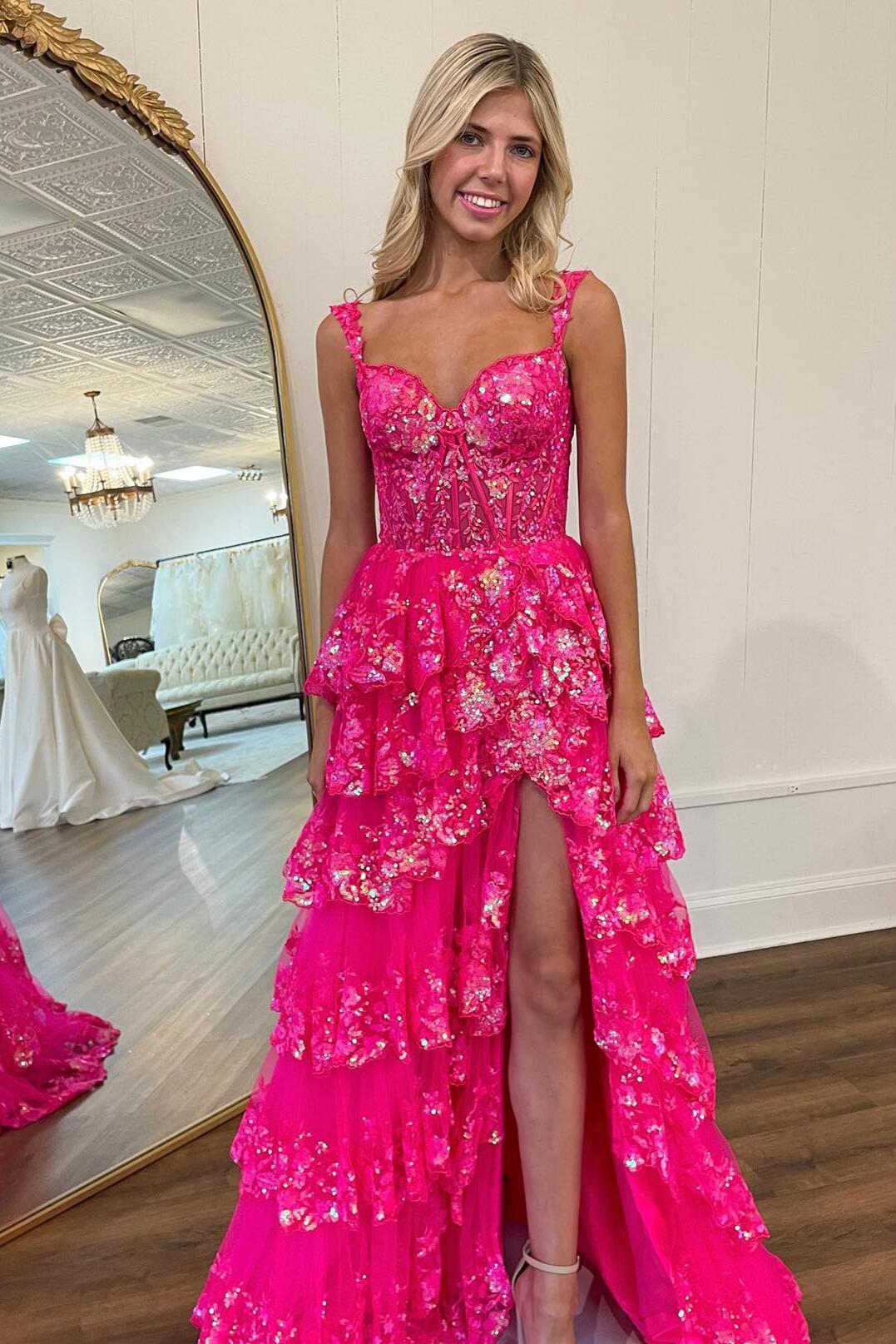 Fuchsia Sequin Tiered Ruffle A-line Long Dress