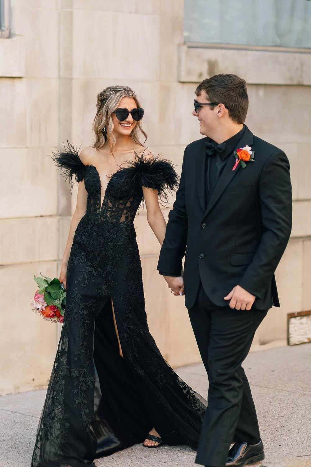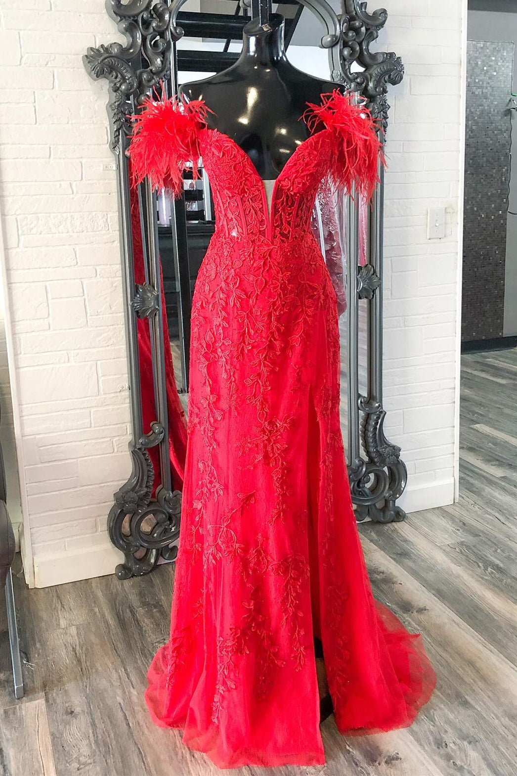 Fur Off the Shoulder Red Lace Mermaid Long Formal Dress