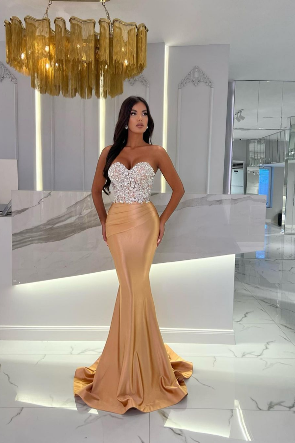 Gold Sequin Mermaid Prom Dress Long Sweetheart Pleated Sleeveless YH0073