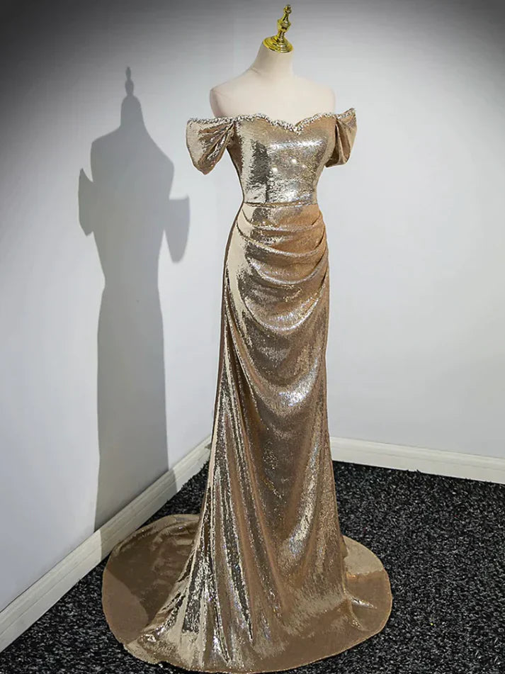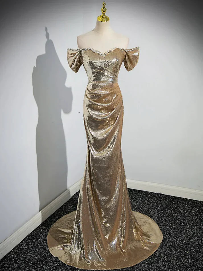 Gold Sequins Off Shoulder Mermaid Long Prom Dress Evening Party Dress Sparkly