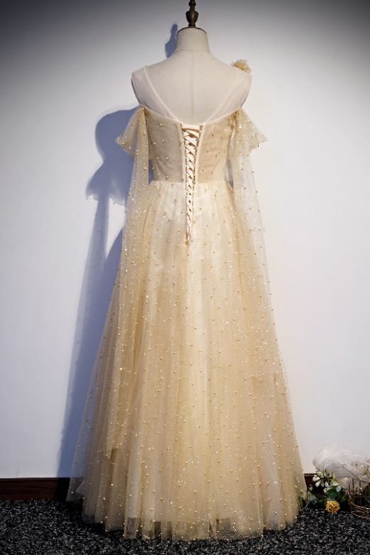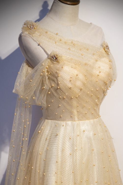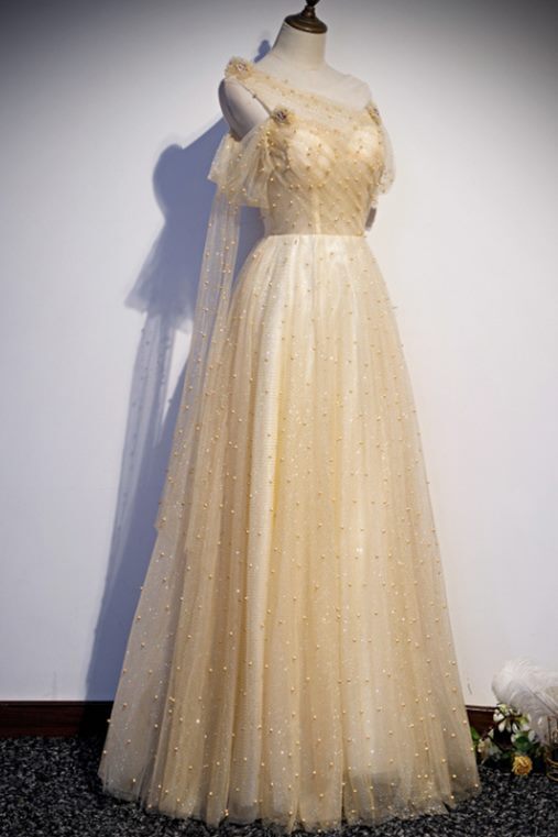 Gorgeous A-line Champagne Pearls Long Prom Dress