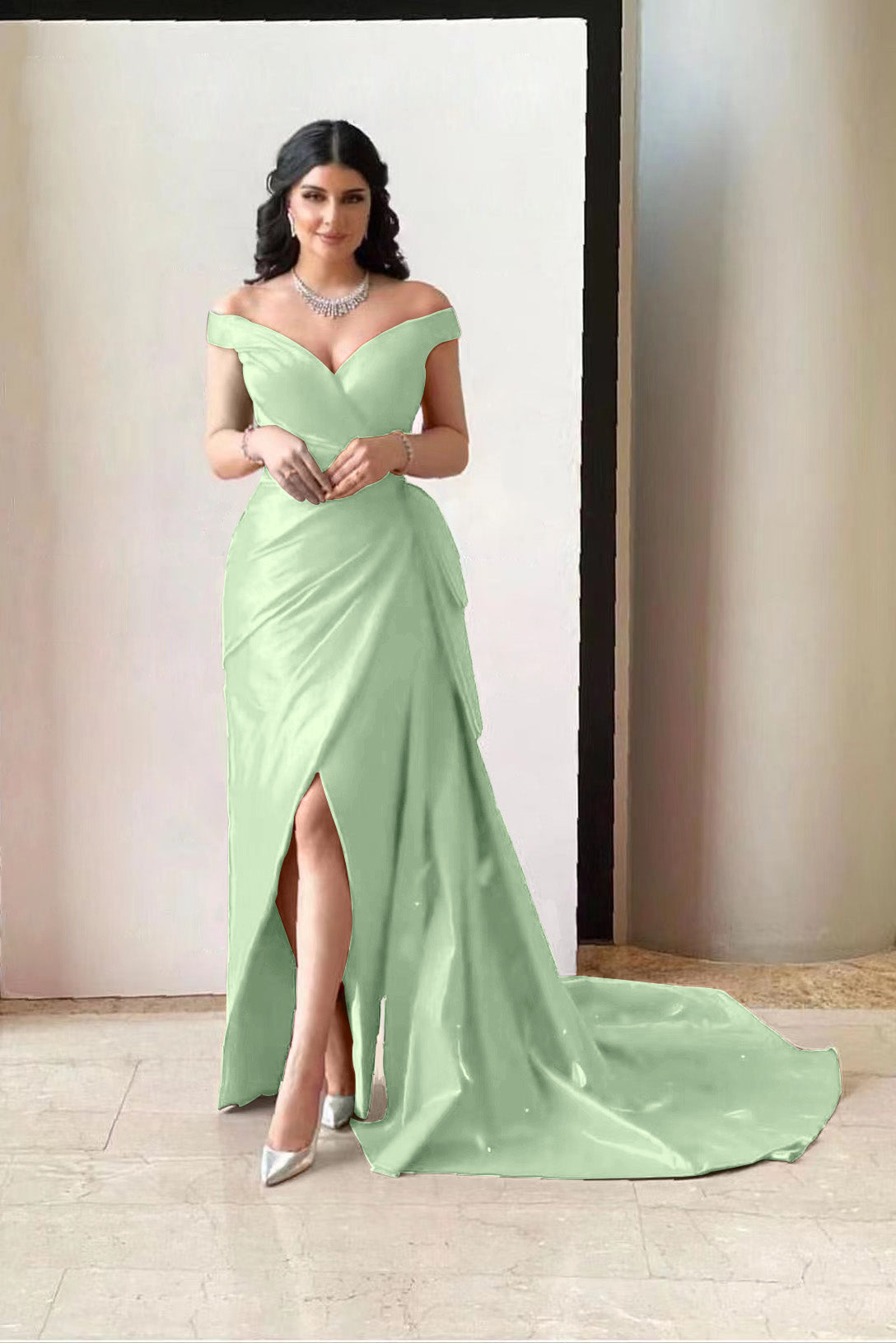 Gorgeous Fuchsia Off-The-Shoulder V-Neck Split Prom Dress With Pleated ED0397