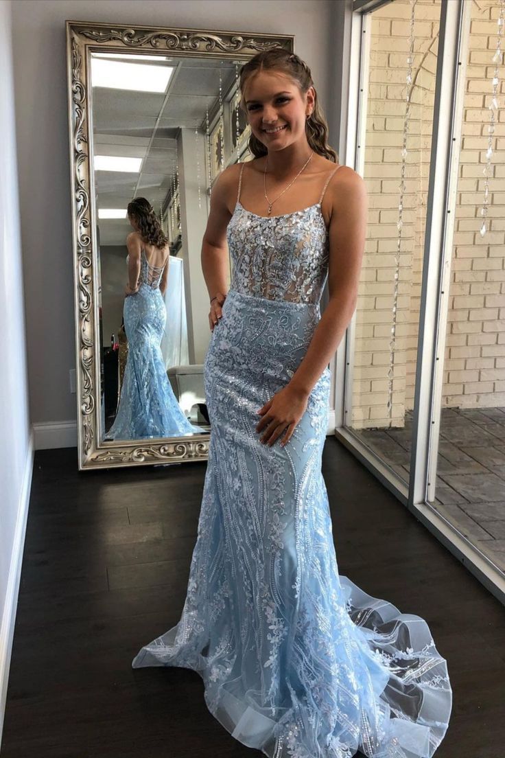 Gorgeous Light Blue Applique Spaghetti Straps Prom Dress