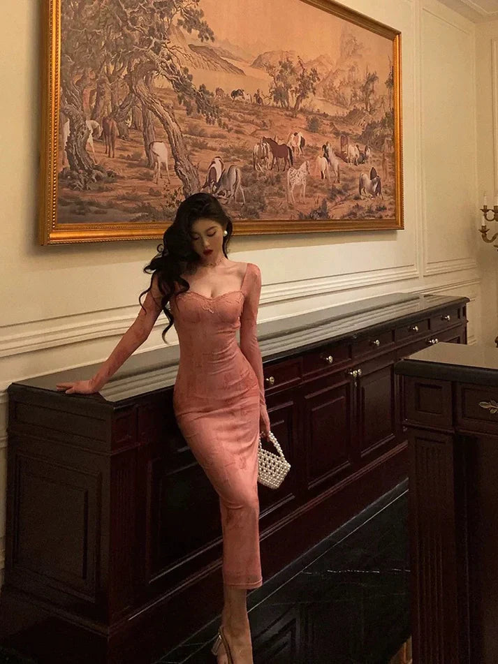 Gorgeous Sheath Square Neckline Long Sleeves Pink Lace Date Night Dress Long Prom Dresses Birthday Outfits, SSR3601