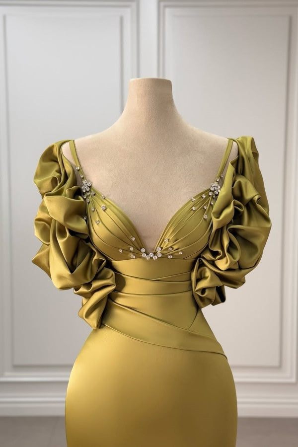Green Pleated Neckline Beaded Ruffle Sleeves Prom Dress ssr0531