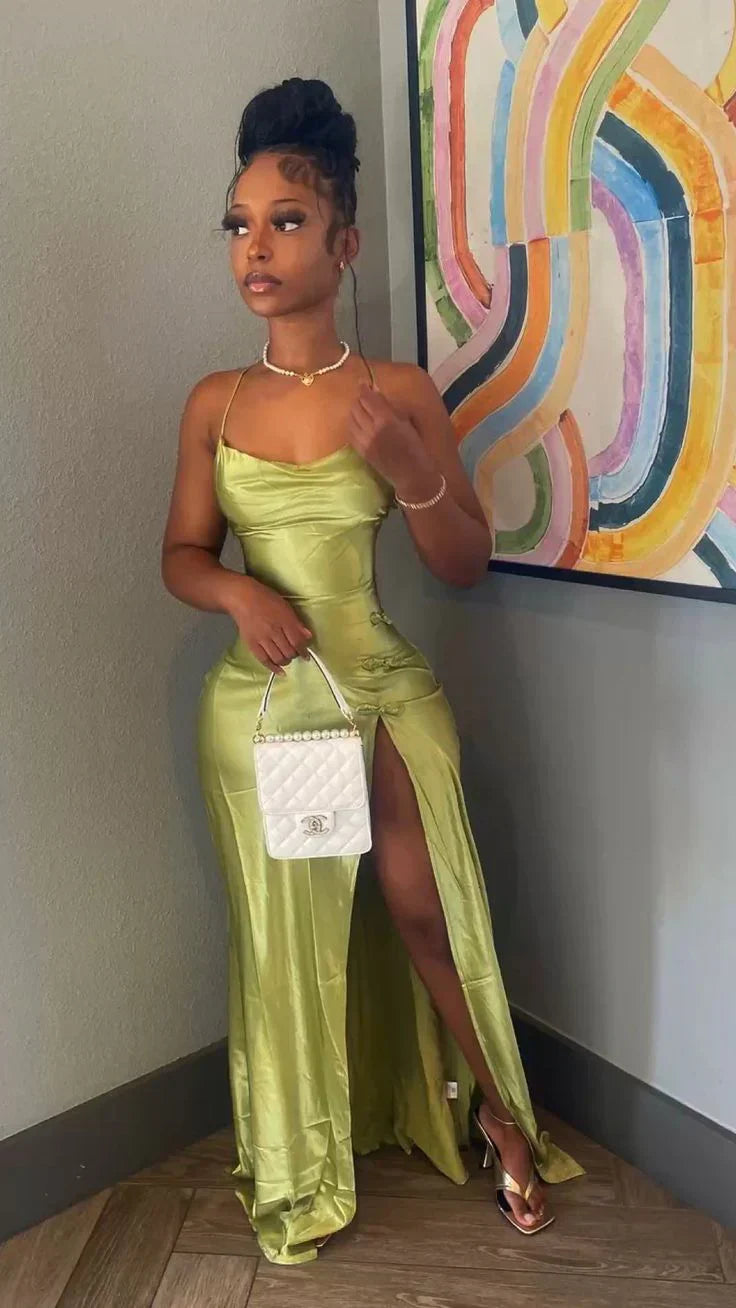 Green Satin Long Evening Party Dress with High Split Sexy Evening Dress Formal Dress
