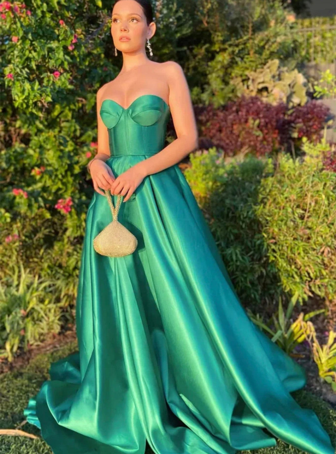 Green Sweetheart Satin A-Line Long Evening Prom Dress With High Slit