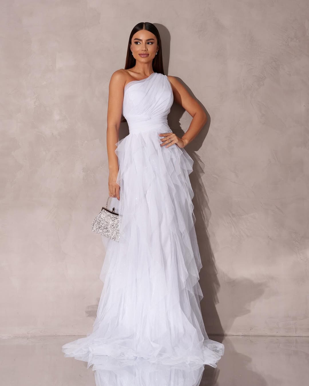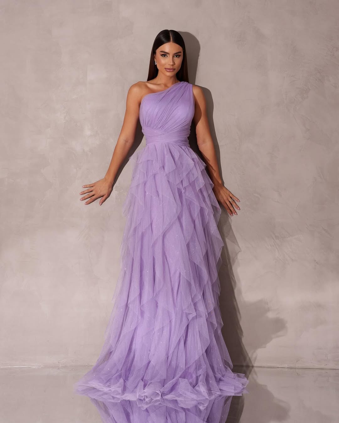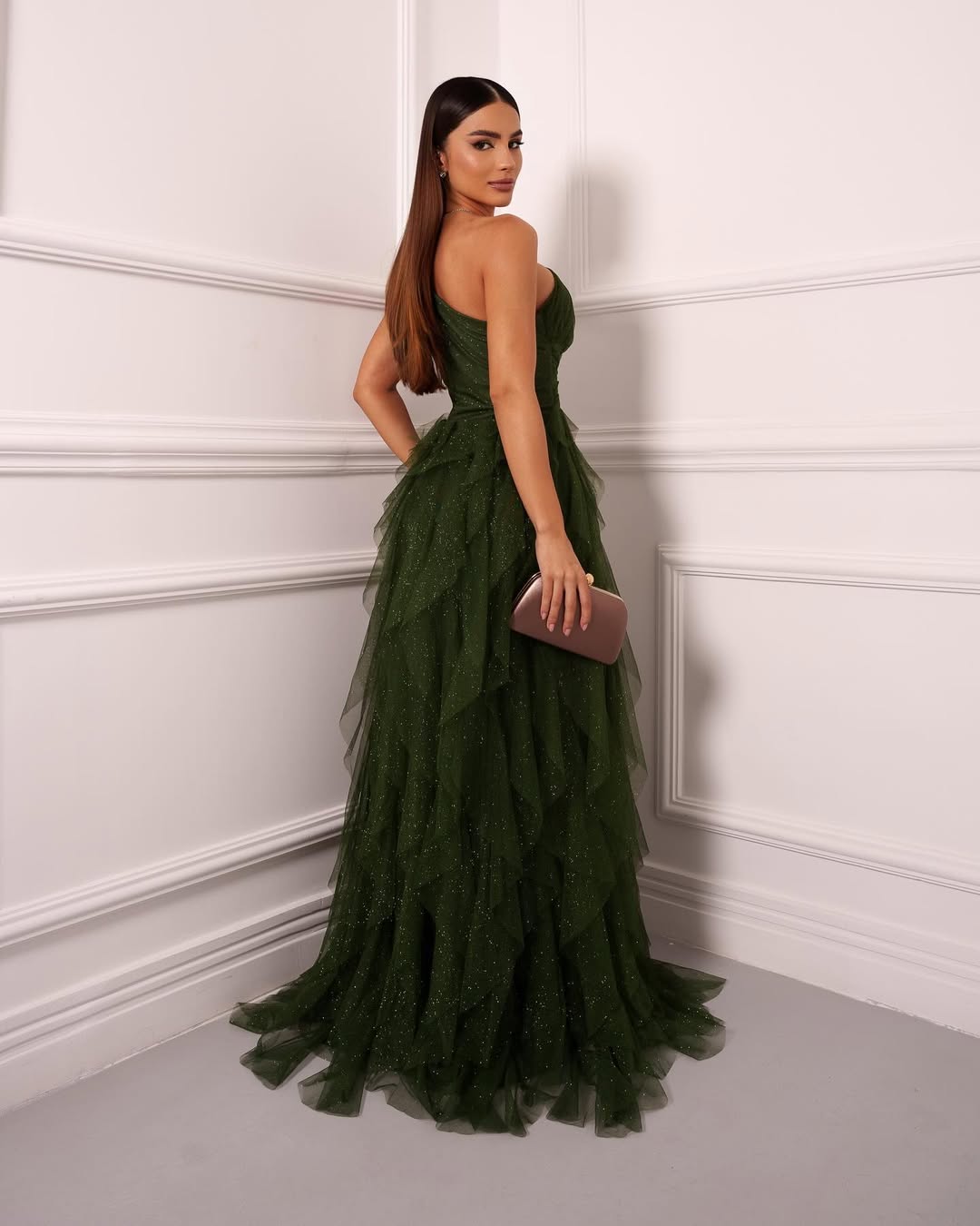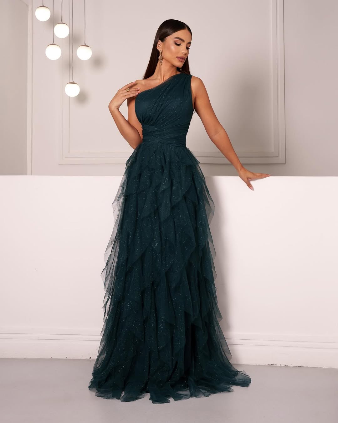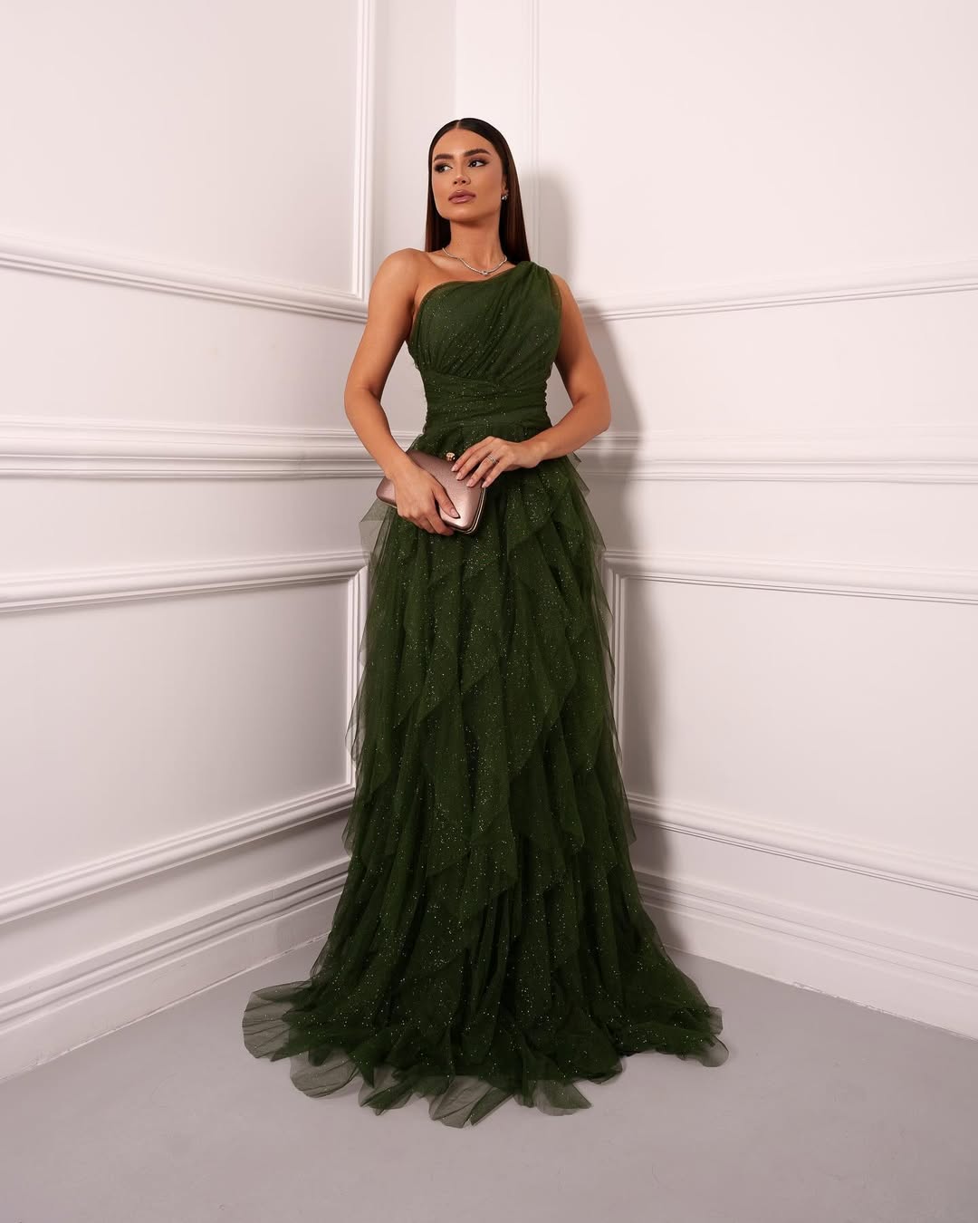 Green Tulle A-Line One-Shoulder Ripple Prom Dress ssr0560