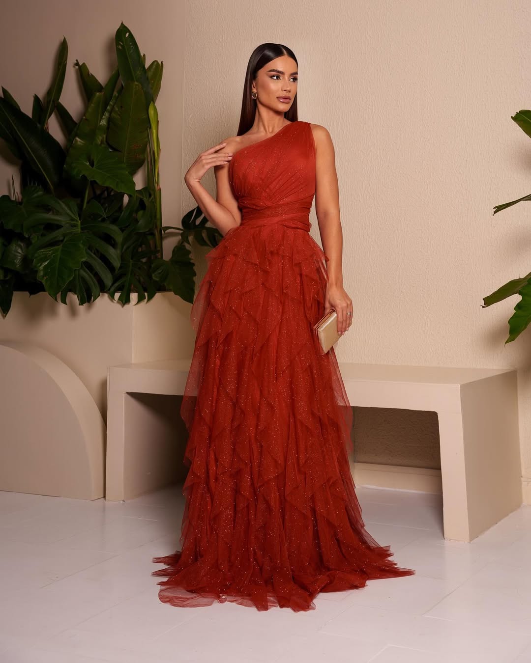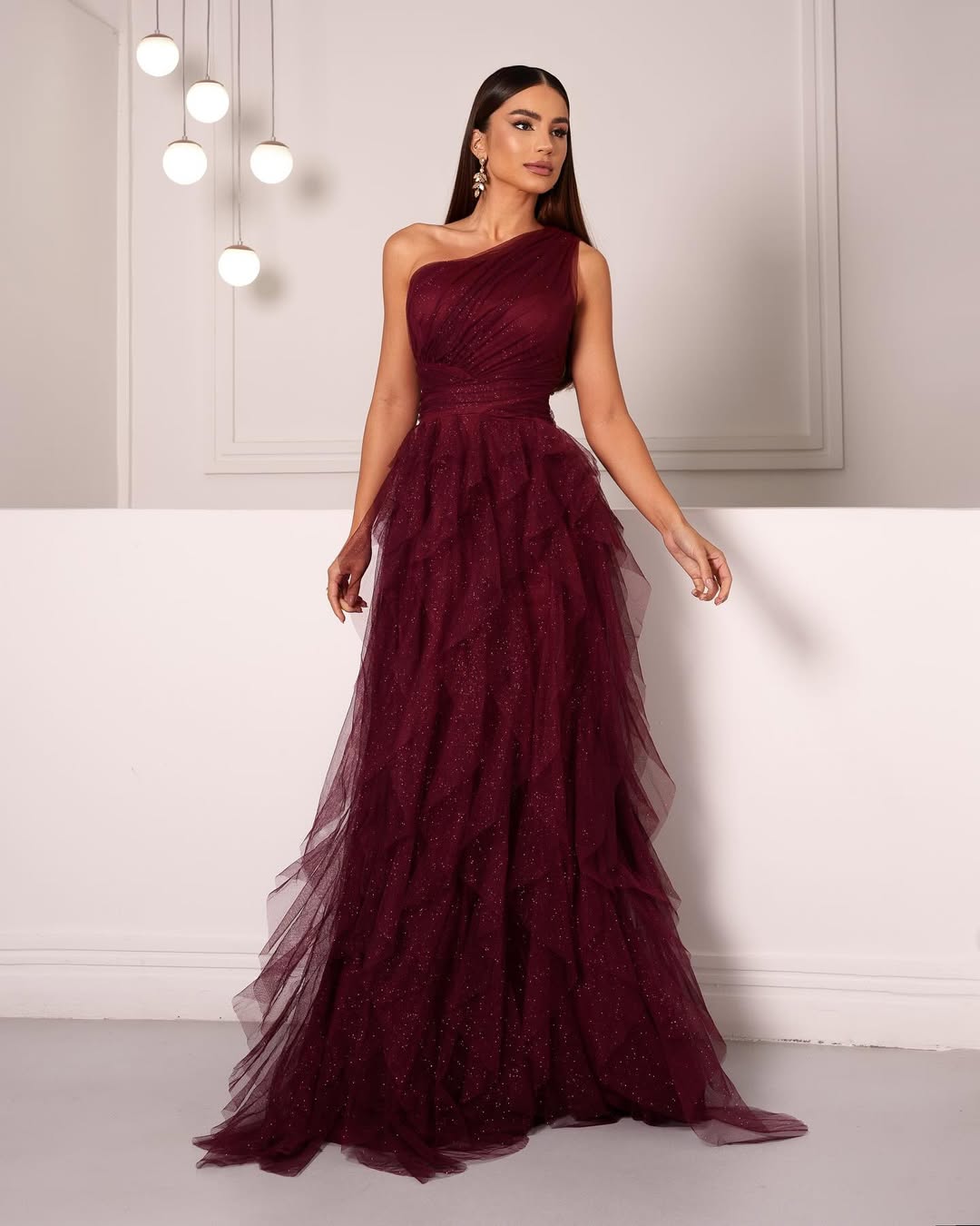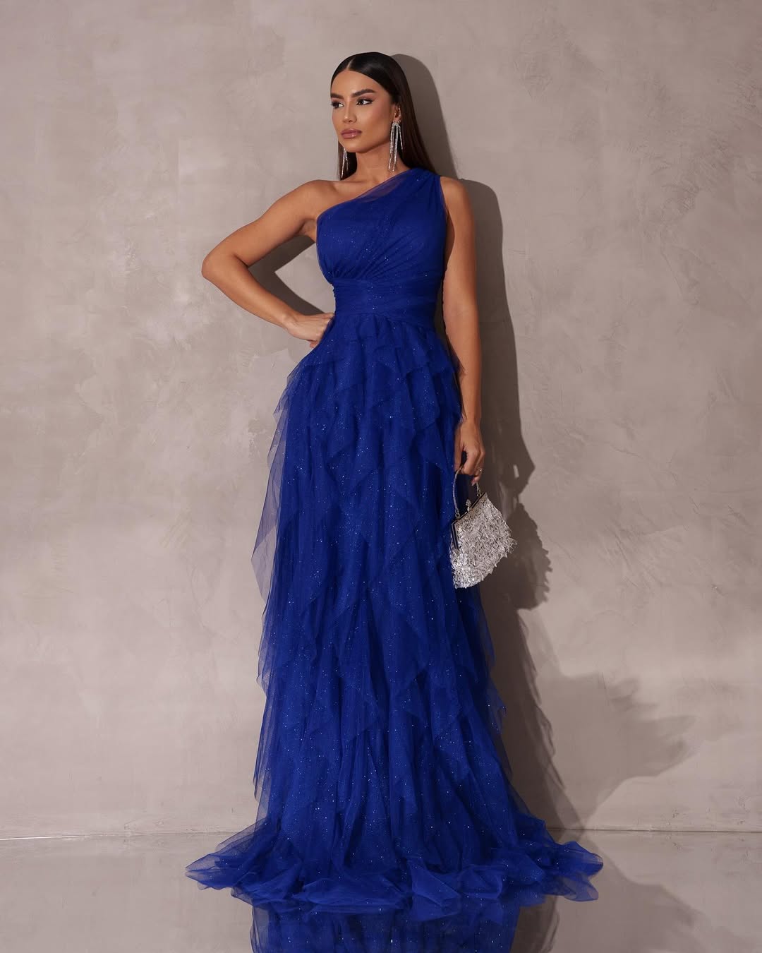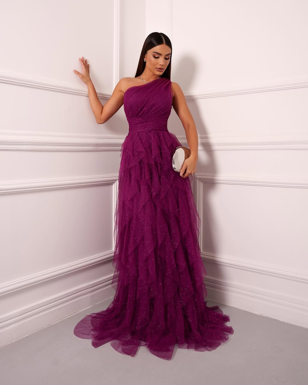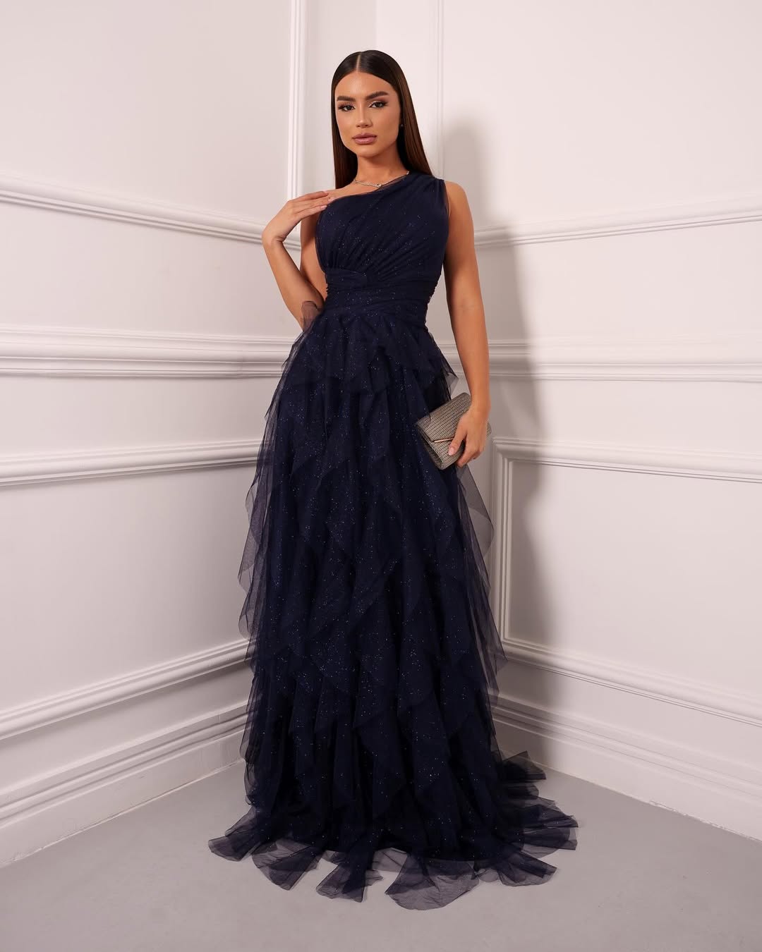 Green Tulle A-Line One-Shoulder Ripple Prom Dress ssr0560