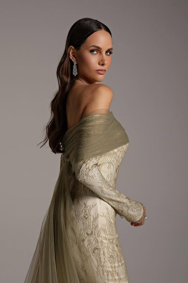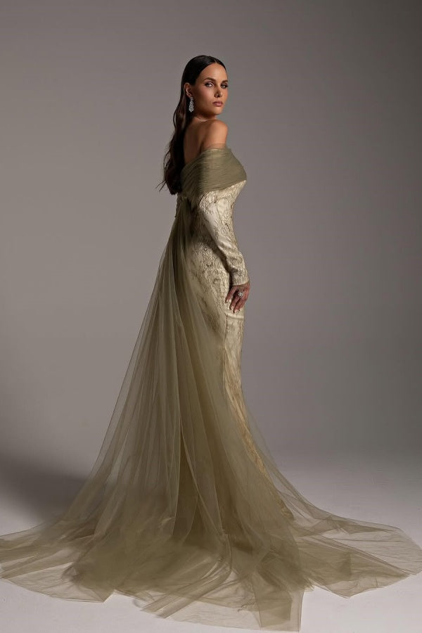 Green Tulle Strapless White Lining Long Sleeves Sheath Prom Dress ssr0641